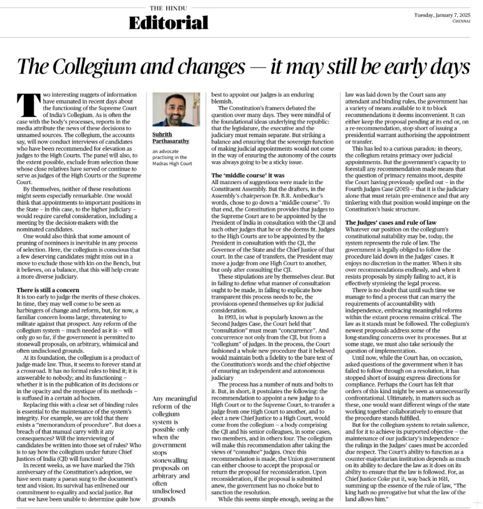 An essay in The Hindu on why any meaningful reform of the collegium system is possible only when the government stops stonewalling proposals, on arbitrary and often undisclosed grounds: https://www.thehindu.com/opinion/lead/the-collegium-and-changes-it-may-still-be-early-days/article69069369.ece