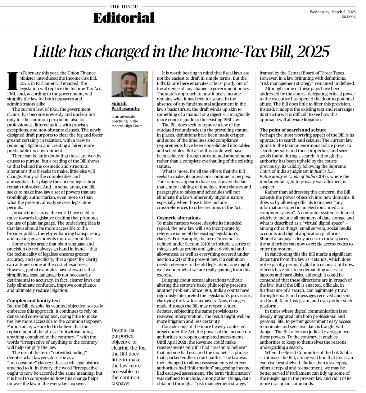 A piece on the new Income Tax Bill, which despite its purported objective of clearing the fog, does little to make the law more accessible to the common taxpayer: https://www.thehindu.com/opinion/lead/little-has-changed-in-the-income-tax-bill-2025/article69291192.ece