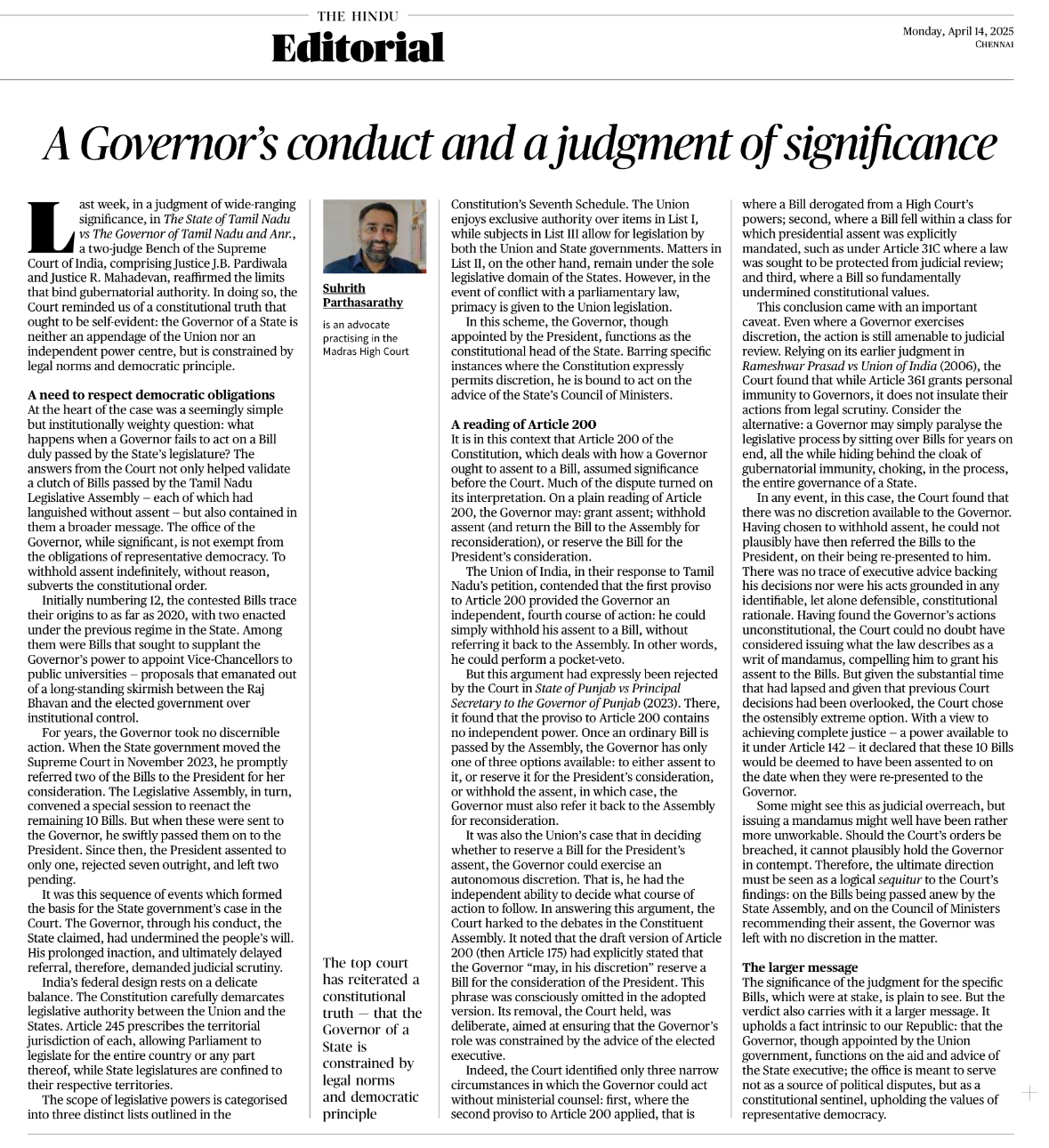 In The Hindu, a piece on a Supreme Court judgment which affirms a constitutional truth: governors of states are constrained by legal norms and democratic principle; they ought to act as constitutional sentinels, upholding the values of representative democracy: https://www.thehindu.com/opinion/lead/a-governors-conduct-and-a-judgment-of-significance/article69446757.ece